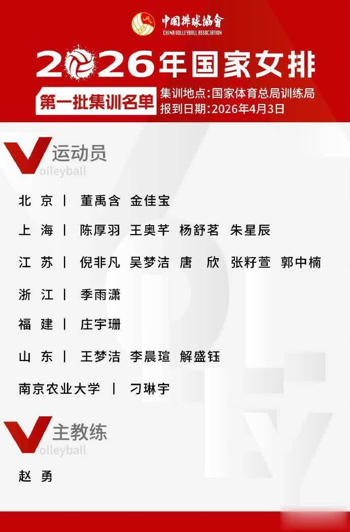 队员们将于4月3日在国家体育总局训练局报到集结。
